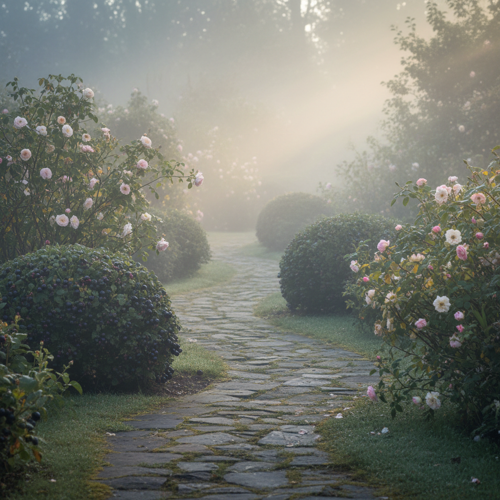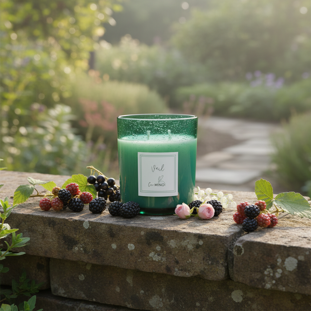 Morning mist over the garden — cool air, soft fruit, petals damp with dew. Sweetness fades into wood, like a memory half-remembered. For the calm between seasons.
